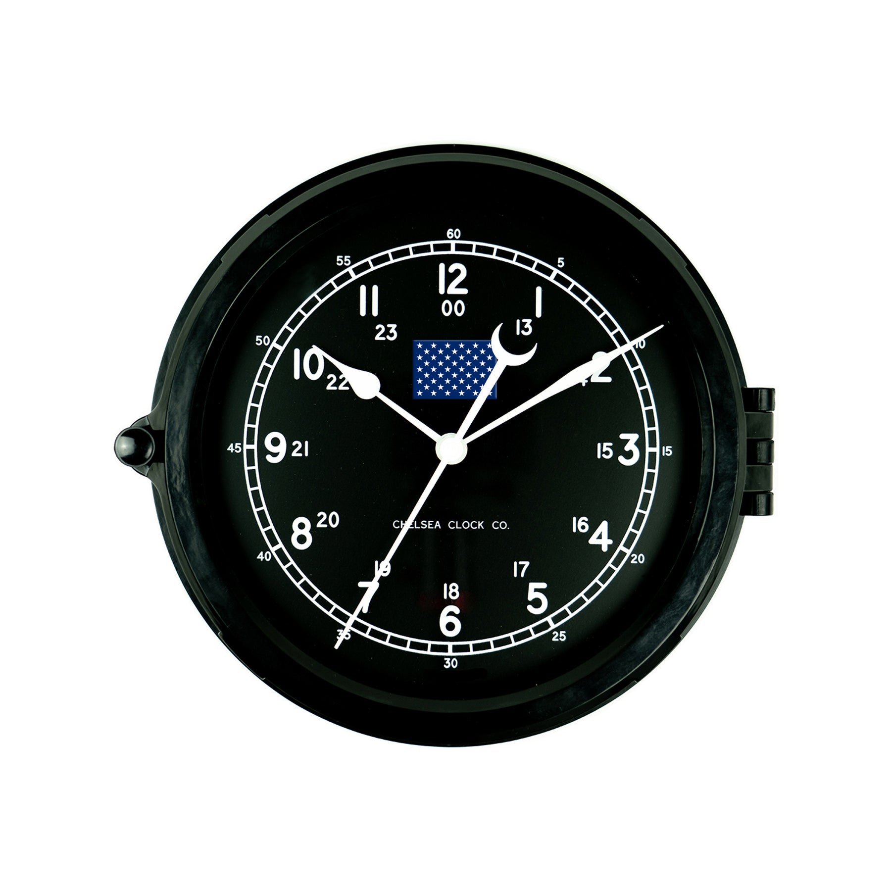 Crafted with a durable, phenolic resin case, this clock is designed to last for generations and is still used aboard U.S. Navy ships. It features a classic black 12/24-hour military-style dial with a sweeping second hand for precise timekeeping and U.S. Navy Jack of the United States logo. A hinged bezel with a clear lens and brass screw-bolt lock allows easy access for adjustments, ensuring both authenticity and everyday functionality.