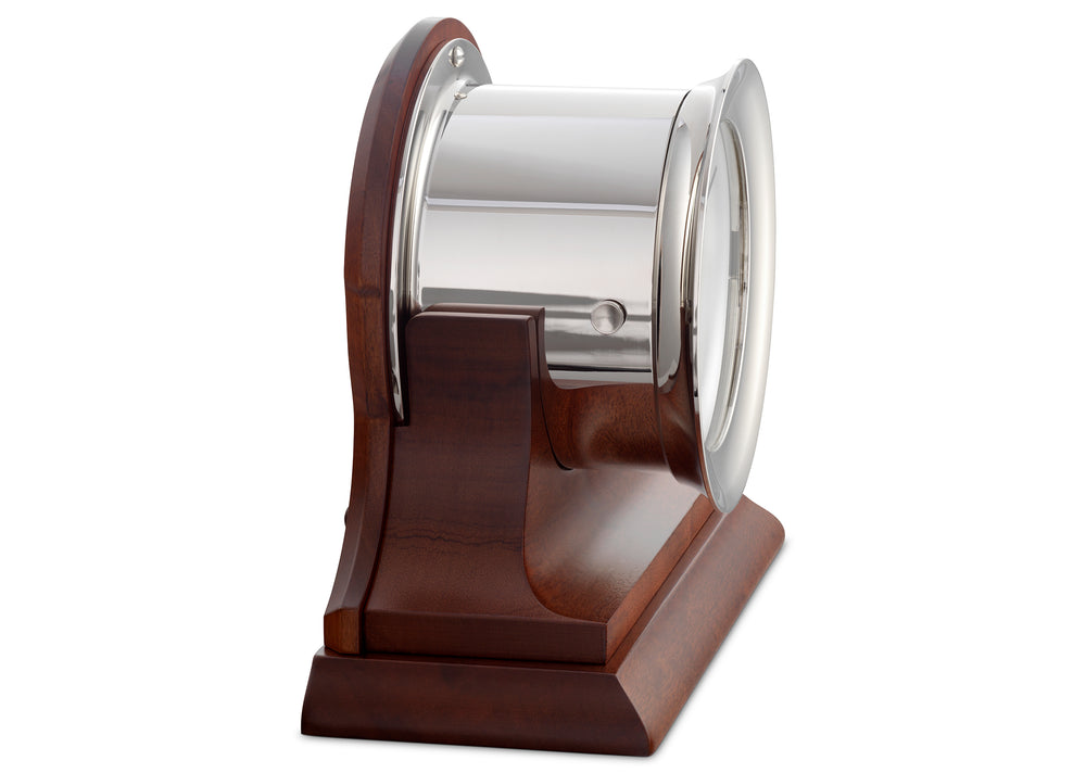 Answer the ocean’s call with a nickel Ship’s Bell 4.5-inch clock mounted on a gracefully curved hardwood base. The timepiece is 100% handcrafted with a solid brass case, lacquered nickel finish and hand-silvered dial. An 11-jewel mechanical movement powers the mariner chimes that richly mark the passage of time. Learn more about this code by clicking on the Ships Bell Story tab. Our nautical mantel clock in nickel is available with personalized engraving that makes it the gift of a lifetime.