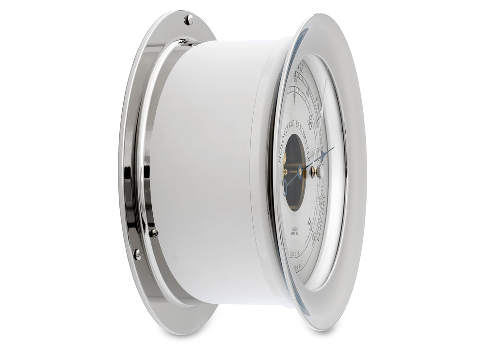 Our classic Ship’s Bell Barometer, designed as a companion piece to the Ship’s Bell Clock, features a double bellows holosteric movement that mechanically measures changes in atmospheric pressure to foretell changing weather. Readings in inches and millibars are handsomely displayed on the piece’s rich, hand-silvered dial.
