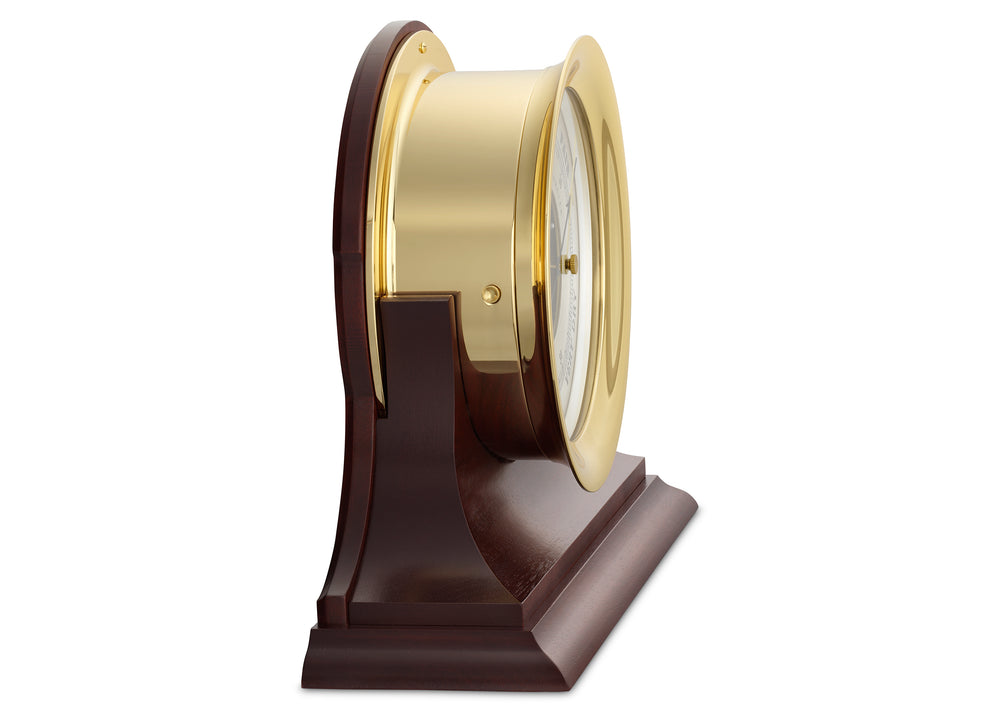 The Ship’s Bell Barometer on traditional base features a lacquered solid forged brass case, hinged bezel and hand crafted solid mahogany base. Barometer movements are automatically calibrated for altitudes up to 2,000 feet, and can be factory-adjusted for altitudes up to 5,000 feet above sea level upon request when placing orders.