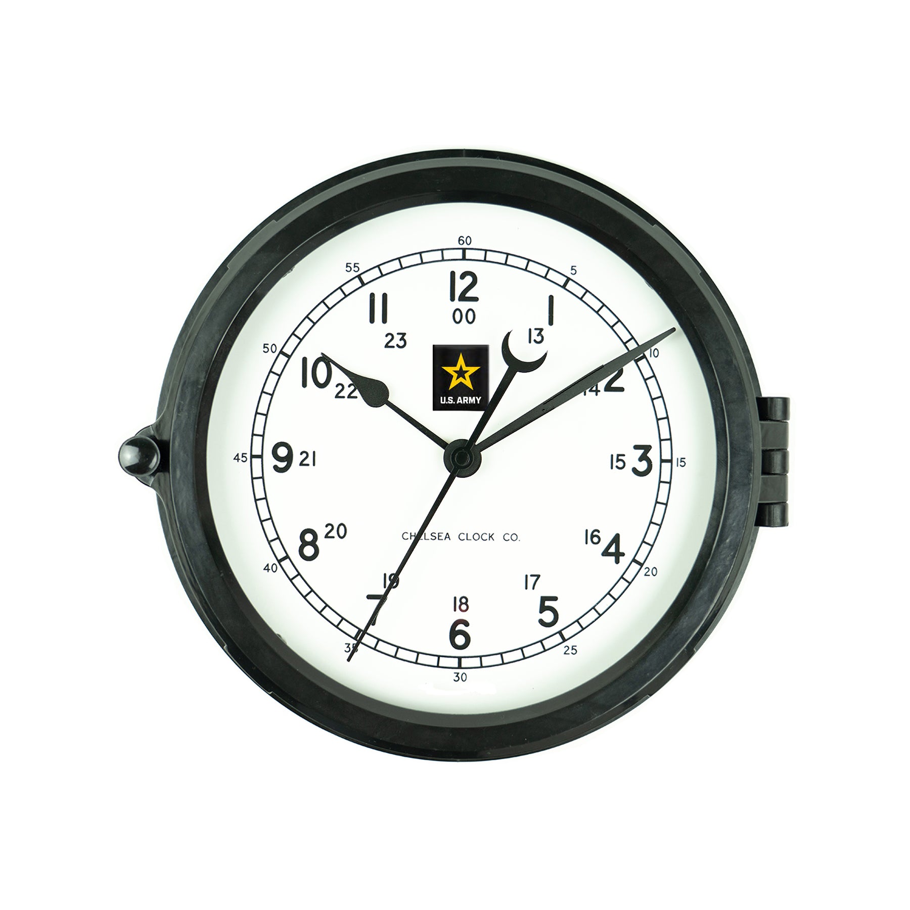 Crafted with a durable, phenolic resin case, this clock is designed to last for generations, and its counterpart is still used aboard U.S. Navy ships. It features a classic black 12/24-hour military-style dial with a sweeping second hand for precise timekeeping and U.S. Army Stacked logo. A hinged bezel with a clear lens and brass screw-bolt lock allows easy access for adjustments, ensuring both authenticity and everyday functionality.