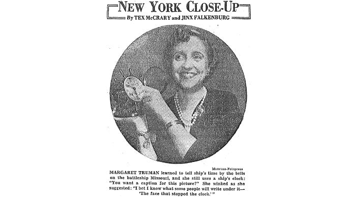 1950: Margaret Truman pictured in the June 26th, 1950 issue of the New York Herald tribune, holding her Chelsea Vanderbilt.