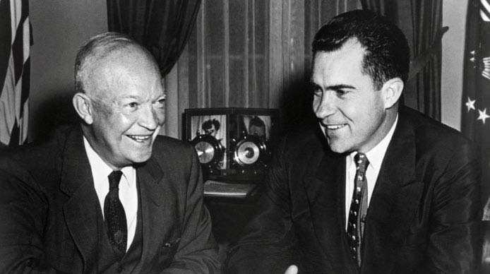 1950’s: President Eisenhower and Vice President Nixon shown in the oval office seated in front of a Chelsea Claremont Clock.