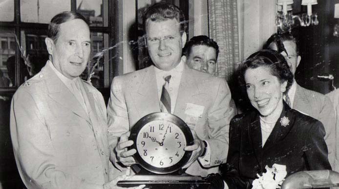 1956: Chelsea Senator Andrew P. Quigley, shown presenting an Admiral Chelsea Clock to General Douglas MacArthur and his wife Jean.