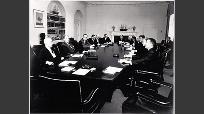Early 1960s: Kennedy administration cabinet meeting with a “Claremont” on the shelves to the left.