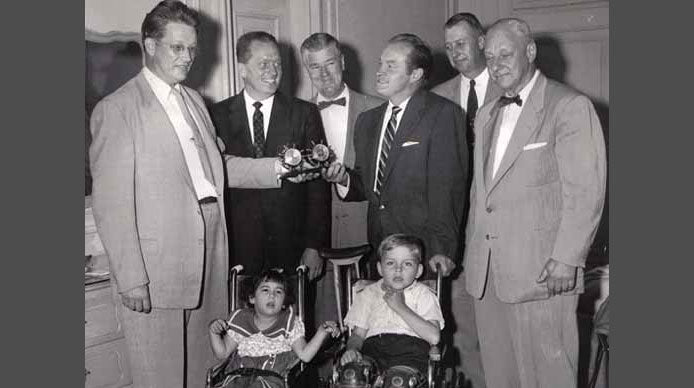 1960s: Bob Hope shown accepting a Chelsea Clock and Barometer award for his humanitarian efforts.