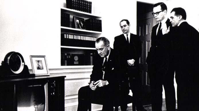 1969: President Johnson watches an Apollo spaceflight from the White House, with his U.S. Navy Chelsea Pilot House Clock resting on his television.