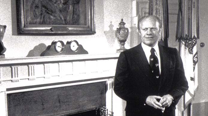 Mid 1970’s: President Gerald Ford in front of the camera at the White House, preparing for broadcast on NBC.