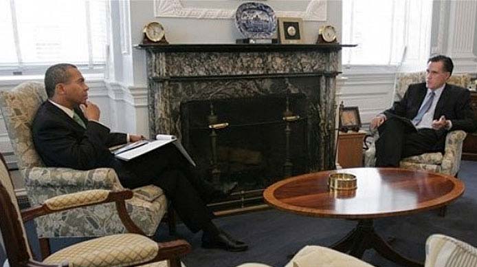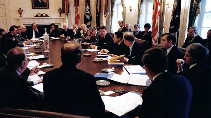 1980’s: Reagan administration cabinet meeting with a matching Chelsea Clock and Barometer set on the mantel.