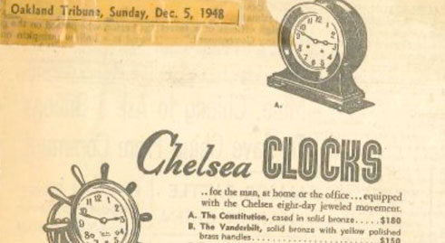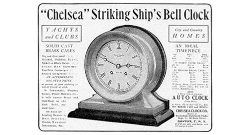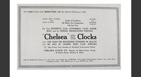Chelsea Clock continues to receive orders from U.S. Government Agencies for marine clocks in increasing quantities - as a result Boston Clock was formed (a separate brand for clocks the company manufactured to meet government standards).