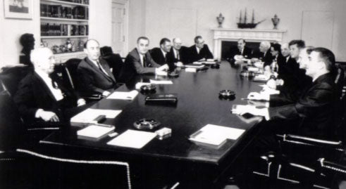 Kennedy administration meeting with a Claremont on the shelves.