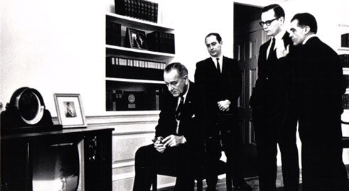 President Lyndon Johnson watches a NASA liftoff, along with a Chelsea.