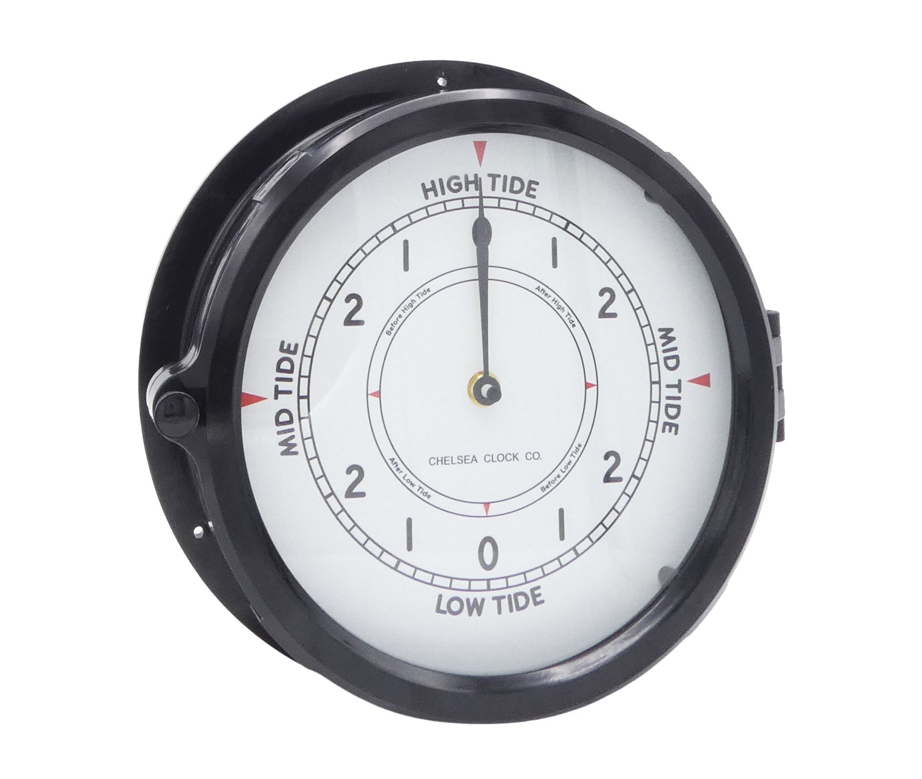 The Naval Deck Tide features an easy- to-read white dial and a precision quartz movement. The case is made from phenolic - a high-impact, heat-resistant black resin that stands up to time and the elements. Featuring a clear glass lens, its hinged bezel and brass screw-bolt lock offer easy access for adjustments. The Naval Deck Tide mounts to most any surface and includes matching black mounting hardware. Designed to display tide readings for East Coast (USA) only.